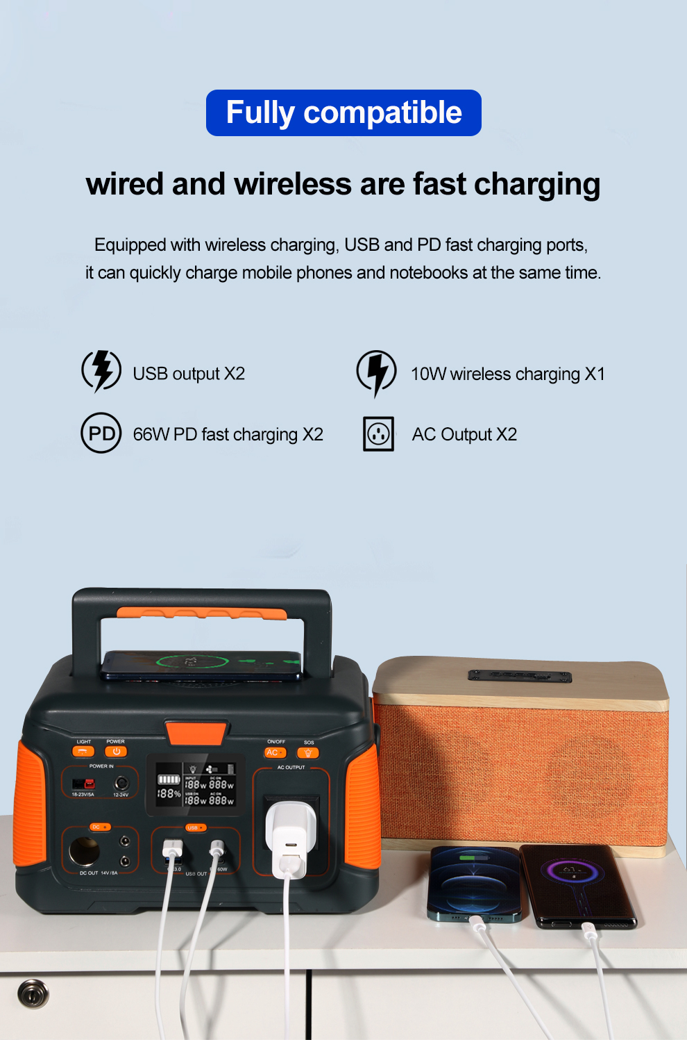 1. Support Multifunctional Outputs:USB outputX2,10W wireless charging X1,66W PD fast chargingX2,AC output X2. With multifunctional ports you can quickly charge mobile phones and notebooks at the same time.